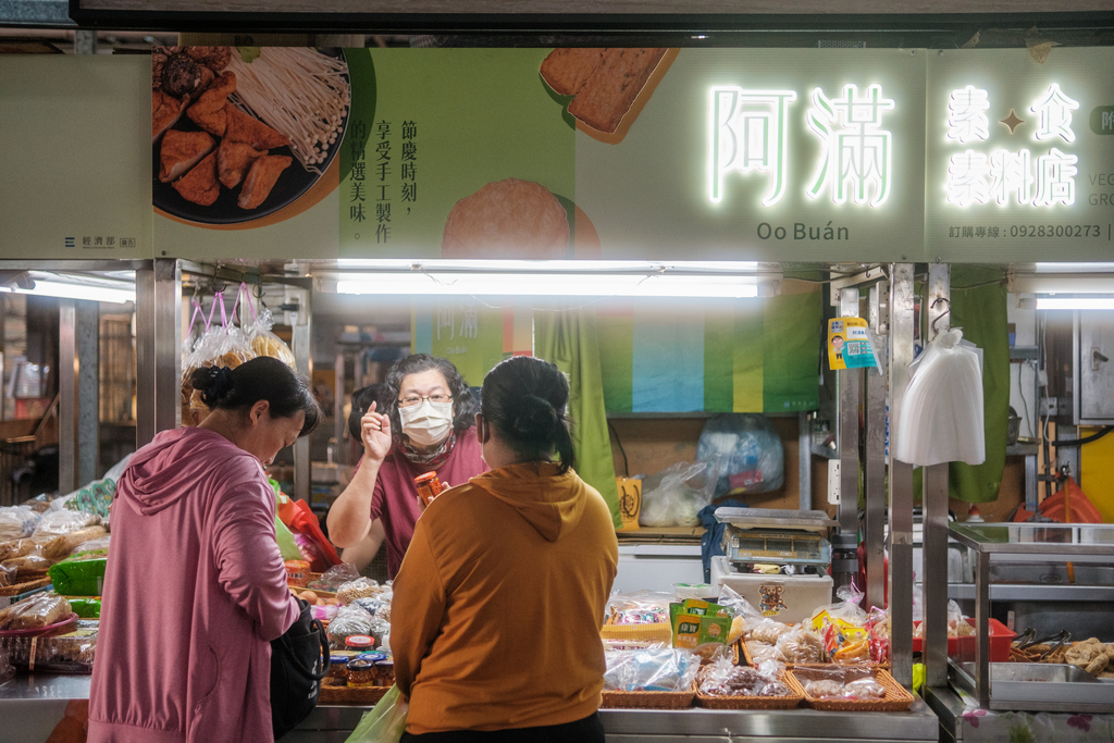 4.形象視覺:設計整體攤位形象識別,並將視覺延伸至攤位後方背板優化,收納空間擴充包覆,通道與內部隱私設計布簾增加攤位特色,推廣宣傳出攤位主打商品,讓阿滿素食整體形象更為醒目亮眼。
